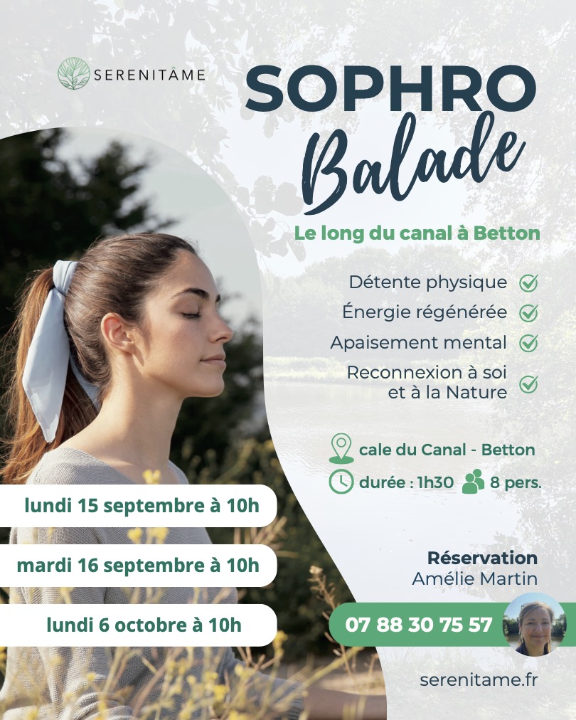 Lors de la sophro-balade, vous alternerez ainsi entre marche libre et consciente, marche respirée, lente ou rythmée, pause sophro (respirations, mouvements de relaxation dynamique, visualisation / relaxation), temps de partage, découvertes ludiques, contemplation, temps de silence / méditatif…